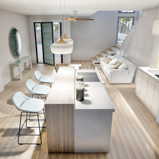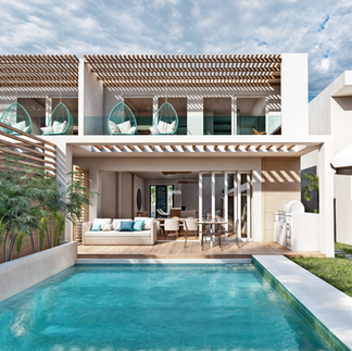 El proyecto se concibe como un dúplex, donde cada unidad es completamente independiente en términos funcionales. Estéticamente, se enfoca en un diseño minimalista, con un 60% de muros en acabados lisos blancos, y el resto combinando piedra arenisca, turquesa y concreto expuesto para integrarse con el entorno seco y transmitir frescura.